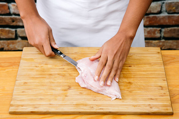 Die Hähnchenbrust durch die Mitte längs halbieren, aber nicht komplett durchschneiden. Die Filets aufklappen und mit Salz und Pfeffer würzen.