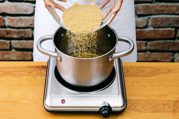 Inzwischen 400ml Wasser im Wasserkocher aufkochen lassen und mit dem Brühwürfel und dem Ras el Hanout in einen mittleren Topf geben.