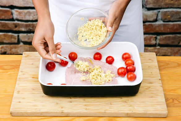 Eine Auflaufform mit etwas Olivenöl einpinseln, die Hähnchen mit Tomaten in die Form geben und alles für ca.10-12Min. im Ofen backen. Die Auflaufform kurz aus dem Ofen nehmen, die Hähnchen mit den Nussbröseln bestreuen und für ca. 2-3Min. auf oberster Schiene rösten, bis die Haube goldbraun ist. Mit Salz und Pfeffer abschmecken.