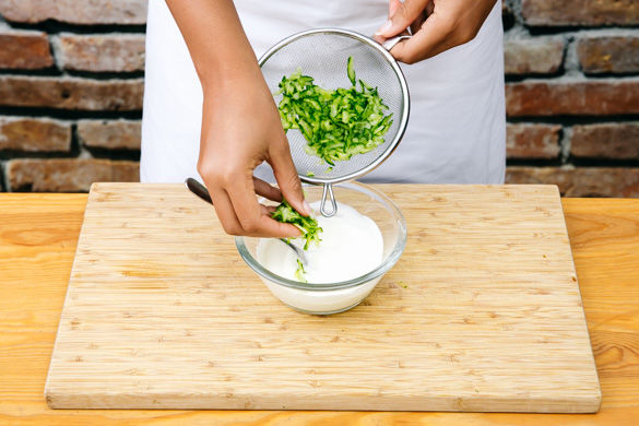 Zum Schluss die Gurke grob raspeln, salzen und das überschüssige Wasser durch ein Sieb ausdrücken. Anschließend mit dem Joghurt vermengen, mit Salz und Pfeffer abschmecken. Die Petersilie fein hacken und mit den Rosinen unter den Couscous mischen. Mit Dip und Hähnchen servieren.