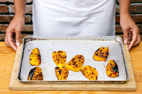 In einem Topf ausreichend leicht gesalzenes Wasser für die Pasta aufsetzen. Den Grillbackofen auf höchster Stufe vorheizen. Die Paprika vierteln, entkernen und mit der Hautseite nach oben auf ein Backblech legen. Mit etwas Olivenöl beträufeln und für ca. 8–10Min. grillen, bis die Haut leicht dunkel wird und aufplatzt. Herausnehmen und abkühlen lassen.