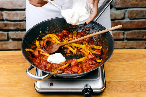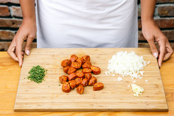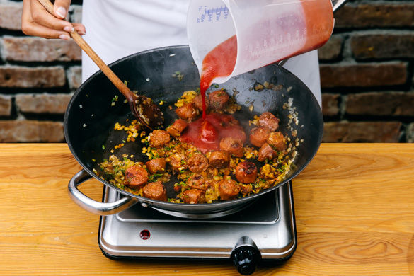 Die Zwiebeln und den Knoblauch mit 1EL Öl in einer großen Pfanne bei niedriger Hitze 1–2Min. glasig dünsten. Die Chorizo hinzufügen und ca. 2–3Min. auf mittlerer Hitze anbraten. Den Brühwürfel hineinbröseln, den Thymian dazugeben, mit dem Paprikapulver bestäuben und alles mit den passierten Tomaten ablöschen. Ca. 6–8Min. köcheln lassen.