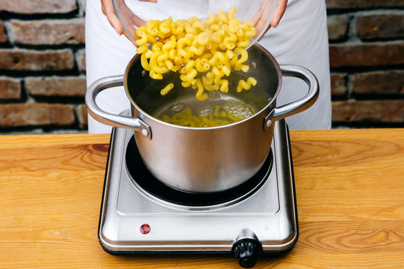 Sobald das Wasser kocht, die Pasta hineingeben und in ca. 6–7Min. bissfest kochen. Ca. 50ml Pastawasser abschöpfen, die Nudeln dann in ein Sieb abgießen, kurz kalt abschrecken und abtropfen lassen.