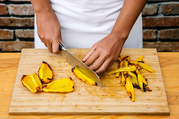 Die abgekühlte Paprika in feine Streifen schneiden und unter die Tomaten-Chorizo-Sauce untermischen.
