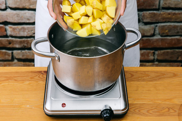 Ausreichend gesalzenes Wasser in einem mittelgroßen Topf für die Kartoffeln zum Kochen bringen. In der Zwischenzeit die Kartoffeln in ca. 2cm große Würfel schneiden. Sobald das Wasser kocht, für ca. 20-25Min. garen, dann abgießen und gut abtropfen lassen.