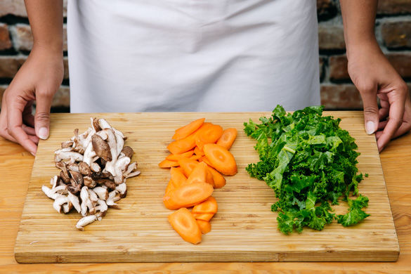 Inzwischen die Shiitake-Pilze putzen und in feine Streifen schneiden. Die Karotten schälen und diagonal in ca. 0,5cm schräge Scheiben schneiden. Den Grünkohl grob hacken.