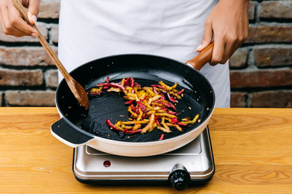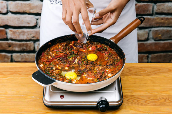 Hier hat sich unsere Köchin Hannah von dem israelischen Nationalgericht “Shakshuka” inspirieren lassen: Zuerst wird ein dicker Sud aus Tomaten, Mangold und Linsen in einer tiefen Pfanne zubereitet. Dann werden Eier in der Sauce gegart, sodass das Eiweiß stockt, das Eigelb aber noch leicht flüssig bleibt. Und dann gibt es noch rauchigen Käse dazu!