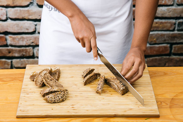 Inzwischen das Baguettebrötchen im Ofen für ca. 2-3Min. aufbacken lassen und dann in schräge Scheiben schneiden lassen. Mit den Eiern servieren.