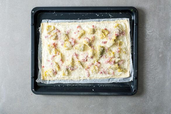 Die Teige mit dem Papier nach unten auf zwei Backblechen ausrollen und gleichmäßig mit der Knoblauchcreme bestreichen. Dann nach Geschmack mit den Artischocken und dem Speck belegen.