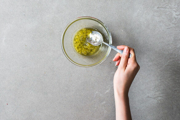 Inzwischen den Knoblauch schälen und fein würfeln, dann mit 2EL Olivenöl und je 1 kräftigen Prise Salz und Pfeffer verrühren.