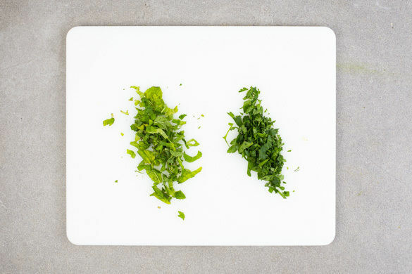 Die Minzeblätter von den Stängeln zupfen und grob schneiden. Die Petersilie samt Stängeln fein schneiden.