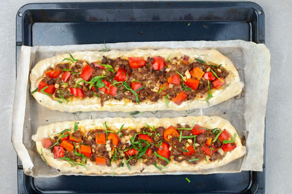 Die Teige mit dem Papier nach unten auf zwei Backblechen ausrollen und jeweils längs halbieren. Die Teigränder ca. 1cm einrollen und die Teige zu leicht ovalen Stücken formen. Die Enden gut zusammendrücken. Die Hackfleischmasse gleichmäßig auf den Teigstücken verteilen und die Pide 15–20Min. im Ofen backen, bis der Teig an den Rändern knusprig und goldbraun ist.