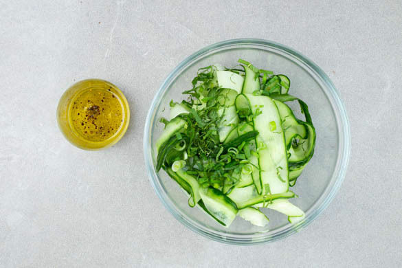 Die Gurken mit einem Sparschäler in feine Streifen schneiden, das Kerngehäuse aussparen. Die Lauchzwiebel in feine Ringe schneiden. Aus 2EL Olivenöl, 2EL Essig, Salz, Pfeffer und 1 Prise Zucker ein Dressing anrühren und mit den Gurken, den Lauchzwiebeln und der Minze vermengen.