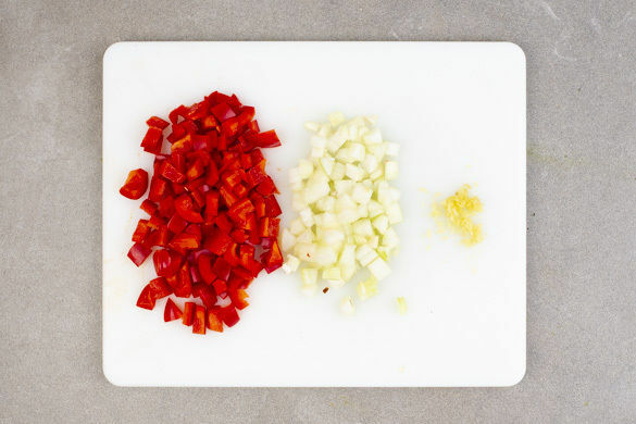 Den Backofen auf 220°C (200°C Umluft) vorheizen. Die Paprika vierteln, entkernen und in ca. 1cm große Würfel schneiden. Die Zwiebel schälen, halbieren und grob würfeln. Den Knoblauch schälen und in kleine Würfel schneiden.