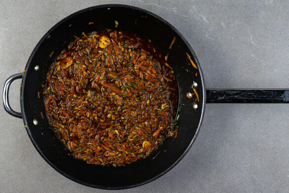 Die Karotten und die Zucchini in einer zweiten großen Pfanne mit 4EL Pflanzenöl bei starker Hitze ca. 2Min. anbraten. Den Knoblauch und die Teriyakisauce unterrühren und alles einmal aufkochen lassen, dann die Pfanne vom Herd nehmen.