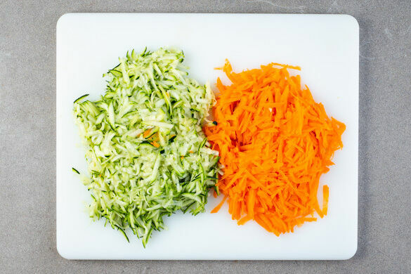 Die Karotten ggf. schälen und mit einer Küchenreibe fein raspeln. Die Zucchini ebenfalls fein reiben.