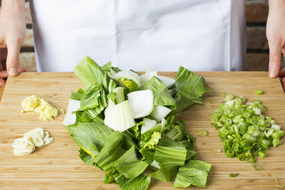 Den Pak Choi vom Strunk befreien und längs halbieren, dann quer in ca. 2cm breite Streifen schneiden. Die Lauchzwiebeln schräg in feine Ringe schneiden.
