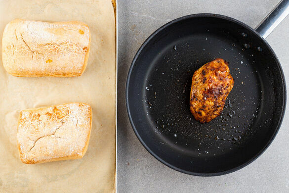 Das Fleisch in einer mittelgroßen Pfanne bei mittlerer Hitze 3–4Min. anbraten. Dann wenden und weitere 2–3Min. braten, bis das Fleisch durch ist. Die Brötchen auf einem mit Backpapier ausgelegten Backblech 4–6Min. im Ofen knusprig aufbacken.