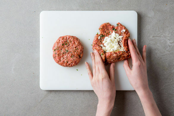 Die Hackfleischmasse in 2 gleich große Portionen teilen. Jede Portion ca. 1cm dick ausbreiten und den Feta gleichmäßig in die Mitte krümeln. Die Fleischränder sorgfältig über dem Käse verschließen.