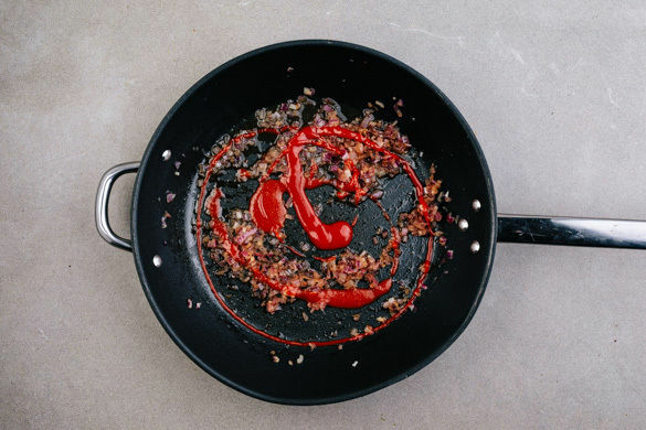 Die Zwiebeln schälen, halbieren, fein würfeln und in einer kleinen Pfanne mit 1TL Olivenöl bei mittlerer Hitze 5–8Min. sanft anbraten. Ggf. etwas Wasser hinzugeben, damit die Zwiebeln nicht anbrennen.