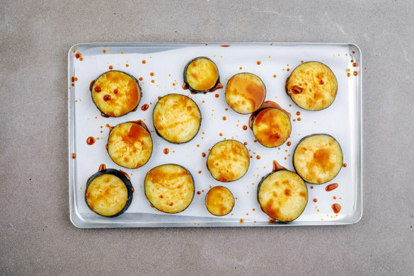 Die Auberginenscheiben auf einem weiteren mit Backpapier ausgelegten Backblech verteilen, ggf. übrige Marinade darüber verteilen und die Auberginen ca. 10Min. im Ofen backen. Die Scheiben einmal wenden und weitere 5–8Min. backen, bis die Auberginen goldbraun und weich sind.