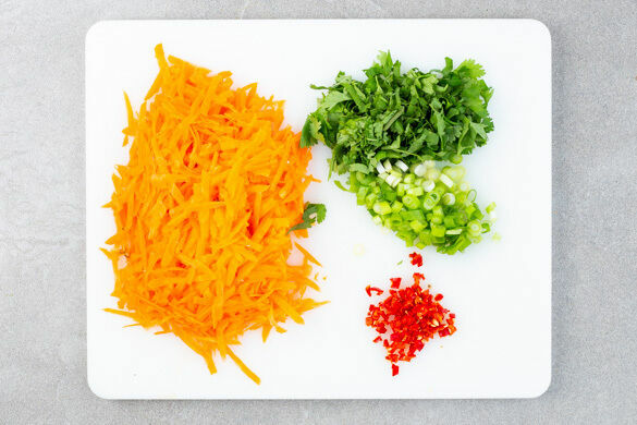 In einem kleinen Topf ausreichend gesalzenes Wasser für die Nudeln aufkochen. Die Karotte ggf. schälen und grob raspeln. Den Koriander samt Stängeln fein schneiden. Die Lauchzwiebel in feine Ringe schneiden. Die Peperoni längs halbieren und fein würfeln. Tipp: Für weniger Schärfe die Kerne entfernen.