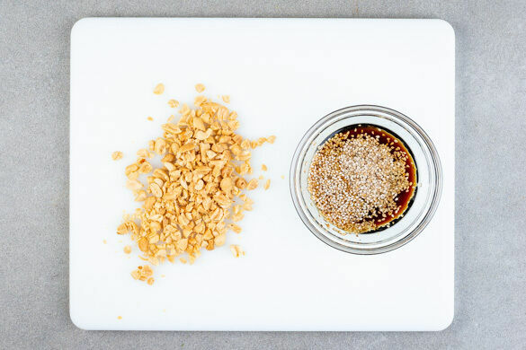 Die Sojasauce mit der Sriracha-Sauce, dem Sesam, 1EL Pflanzenöl und 1EL hellem Essig verrühren. Die Erdnüsse fein hacken.