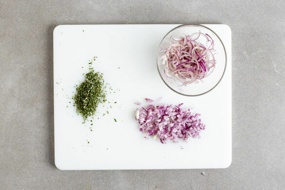 Den Backofen auf 230°C (210°C Umluft) vorheizen. Die Zwiebel schälen und halbieren. Eine Hälfte in kleine Würfel schneiden, die andere Hälfte in feine Streifen schneiden, mit 1TL Olivenöl vermengen und beiseitestellen. Die Rosmarinnadeln abzupfen und fein schneiden.