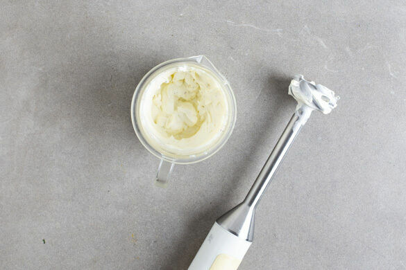Den Ziegenfrischkäse mit der Crème fraîche in einem hohen Gefäß mit einem Stabmixer pürieren und die Creme mit Salz und Pfeffer gut abschmecken. Die Birnen halbieren, entkernen und der Länge nach in dünne Scheiben schneiden.