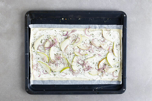 Die Teige mit dem Papier nach unten auf zwei Backblechen ausrollen, gleichmäßig mit der Creme bestreichen und mit dem Rosmarin sowie 1 Prise Pfeffer bestreuen. Darauf die Birnen und die Zwiebelstreifen verteilen und die Flammkuchen in 12–15Min. im Ofen goldbraun und knusprig backen. Je nach Ofen die Position der Bleche nach der Hälfte der Zeit tauschen.