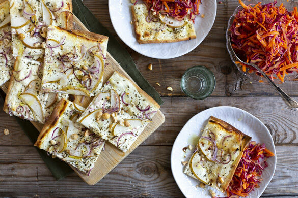 Es wird heiß ... flammend heiß! Du ahnst es schon: Es gibt Flammkuchen. Und die heutige Variante der Spezialität aus dem Elsass überzeugt garantiert. Die Basis allein aus Crème fraîche und Ziegenfrischkäse hat es schon in sich, aber warte, bis sich noch frischer Rosmarin, fruchtige Birne und geröstete Haselnüsse dazugesellen! Und auch der leckere Coleslaw ist nicht zu verachten. Da bleibt nur eins: Guten Hunger!