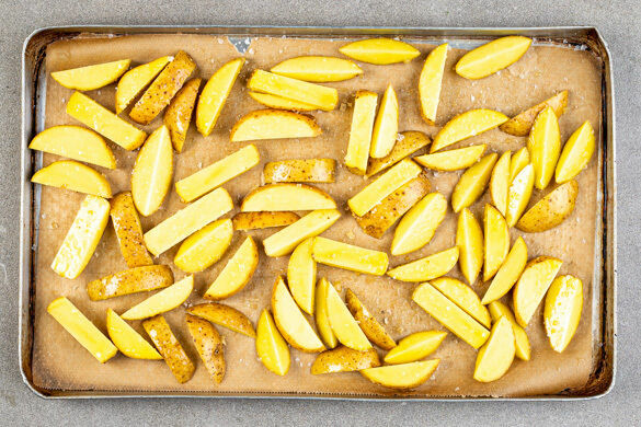 Den Backofen auf 240°C (220°C Umluft) vorheizen. Die Kartoffeln samt Schale in ca. 1cm dicke Stifte schneiden. Die Kartoffeln mit 1EL Pflanzenöl und ½TL Salz vermengen, auf einem mit Backpapier ausgelegten Backblech verteilen und 20–25Min. im Ofen backen, bis sie goldbraun sind. Die Brötchen in den letzten 2–3Min. mitbacken.