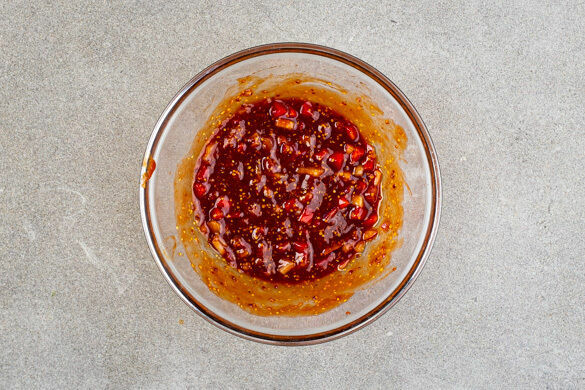 Die Sojasauce mit ½TL Chiliflocken, 4EL Ketchup und 1TL Senf verrühren, dann mit den Paprikawürfeln und den eingelegten Zwiebelwürfeln vermengen. Tipp: Wer es nicht so scharf mag, verwendet weniger Chiliflocken.