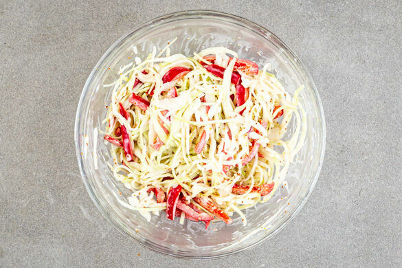 Den Weißkohl mit ½TL Salz vermengen und mit den Händen gut durchkneten. 3EL Mayonnaise mit 1TL Senf, 1TL Honig, 1TL Wasser und 1 Prise Pfeffer zu einem Dressing verrühren. Den Weißkohl und die Paprikastreifen mit dem Dressing vermengen.