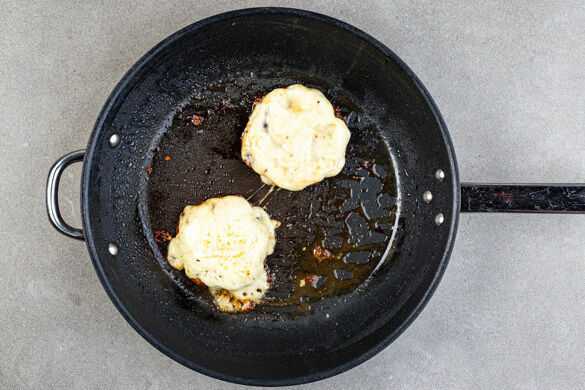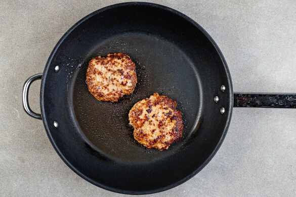 Das Hackfleisch mit ½TL Salz, den restlichen Zwiebeln und ½TL Pfeffer vermengen. Mit feuchten Händen 2 Pattys formen. In einer mittelgroßen Pfanne 1EL Pflanzenöl bei starker Hitze erwärmen. Die Pattys in das heiße Öl geben, dann mit einem Pfannenwender auf eine Dicke von ca. 0,5cm flach drücken. Auf jeder Seite 1–2Min. braten, bis die Pattys gar sind.