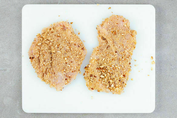 Das Fleisch trocken tupfen und jeweils horizontal halbieren. Zwischen zwei Lagen Frischhaltefolie mit einem Fleischklopfer oder dem Boden einer schweren Pfanne flach klopfen und nacheinander in 4EL Mehl, 1 verquirltem Ei und der Nussmischung panieren.