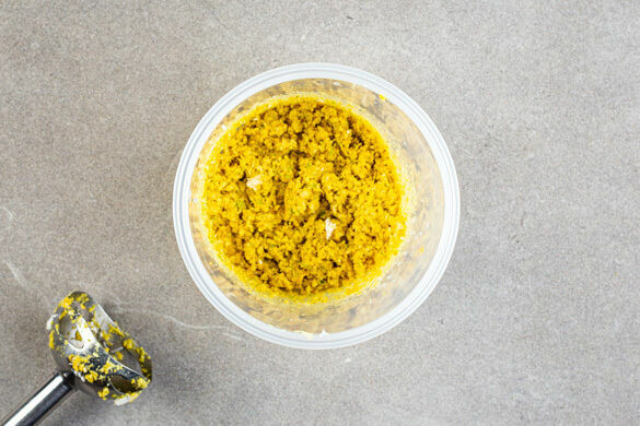 Den Backofen auf 240°C (220°C Umluft) vorheizen. Die Limettenschale abreiben, dann die Limette halbieren und eine Hälfte auspressen. Die Peperoni entkernen und grob würfeln. Mit der Knoblauch-Ingwer-Paste, dem Currypulver, den Kokosraspeln, 2EL Kokosmilch und 2EL Limettensaft pürieren.