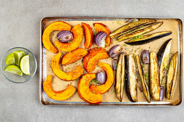 Den Kürbis halbieren, entkernen und in ca. 1cm dicke Spalten schneiden. Die Aubergine längs halbieren, dann der Länge nach in 1–2cm breite Spalten schneiden. Die Zwiebel schälen, halbieren und jede Hälfte in 3 Spalten schneiden.