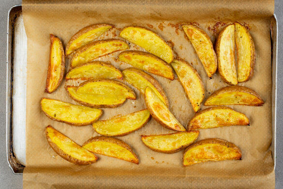 Die Kartoffeln samt Schale in 1–2cm breite Spalten schneiden, dann mit 1EL Pflanzenöl sowie je 1 kräftigen Prise Salz und Pfeffer vermengen. Die Kartoffeln auf einem mit Backpapier ausgelegten Backblech verteilen und im oberen Teil des Ofens 22–25Min. backen, bis sie goldbraun und knusprig sind.
