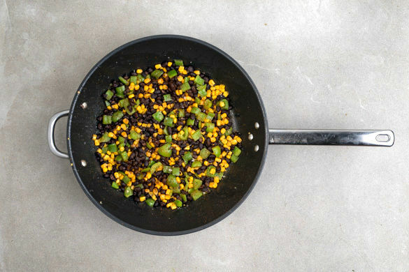 Die Paprika, den Mais und die Bohnen in einer großen Pfanne mit 1TL Olivenöl bei mittlerer Hitze anbraten. Die Gewürzmischung dazugeben, gut vermischen und unter gelegentlichem Rühren 3–4Min. weiterbraten, bis die Paprika weich wird und die Bohnenflüssigkeit weitgehend verdampft ist.