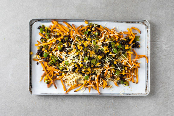 Perfektes Comfortfood für den perfekten Abend: Die Süßkartoffelpommes werden mit einem Mix aus Paprika, Mais und schwarzen Bohnen überbacken – ein bisschen süß, ein bisschen würzig und mit viel Käse. Dazu gibt es eingelegte rote Zwiebeln und frischen Koriander.