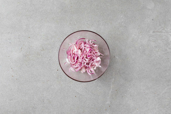 Die Limette halbieren und auspressen. Die Zwiebel schälen, halbieren, in dünne Streifen schneiden und mit 1–2EL Limettensaft, 2–3EL Essig, 1TL Zucker und ½TL Salz vermengen. So lange rühren, bis der Zucker sich aufgelöst hat. Die Zwiebeln sollten gut bedeckt sein. Beiseitestellen und zwischendurch gelegentlich umrühren.