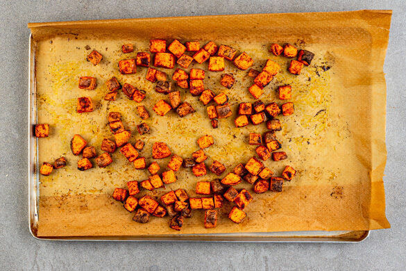 Den Backofen auf 240°C (220°C Umluft) vorheizen. Die Chiliflocken in heißem Wasser einweichen. Die Süßkartoffeln samt Schale in ca. 1,5cm große Würfel schneiden. Die Zwiebeln schälen, halbieren und fein würfeln. Tipp: Ggf. weniger Chiliflocken verwenden, um die Schärfe zu reduzieren.