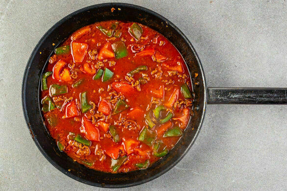 Die Tomaten, das Tomatenmark, ¾ des Knoblauchs, die Dillstängel und 300–350ml Wasser in die Pfanne geben und bei mittlerer Hitze 10–15Min. köcheln lassen. Ggf. mehr Wasser hinzufügen. Die Sauce mit Salz und Pfeffer abschmecken.