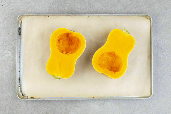 Den Backofen auf 240°C (220°C Umluft) vorheizen. Die Kürbisse der Länge nach halbieren, von den Kernen befreien und auf ein mit Backpapier belegtes Backblech geben. Im Ofen 30–35Min. backen. Tipp: Je nach Größe des Backblechs ggf. ein zweites Backblech verwenden, da später auch der Rosenkohl dazugelegt wird.