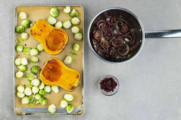 Den Rosenkohl mit der ½ der Gewürzmischung, 1EL Olivenöl sowie je 1 kräftigen Prise Salz und Pfeffer vermengen und während der letzten ca. 8Min. der Garzeit zum Kürbis auf das Blech geben und mitbacken. Die Zwiebeln in einem kleinen Topf bei mittlerer Hitze mit 1EL Olivenöl und je 1TL Salz und Zucker 3–5Min. karamellisieren. Die Cranberrys in ein Sieb abgießen.