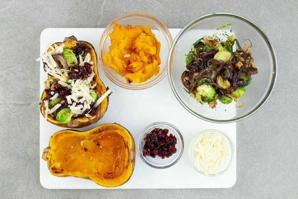 Die Kürbishälften mit einem Löffel 2–3cm tief aushöhlen, das Kürbisfleisch aufbewahren. Den Rosenkohl mit den Zwiebeln und den Walnüssen vermengen und in die Kürbishälften geben. Mit den Cranberrys und dem Käse bestreuen und den gefüllten Kürbis weitere 10–15Min. backen, bis der Käse zerlaufen ist.