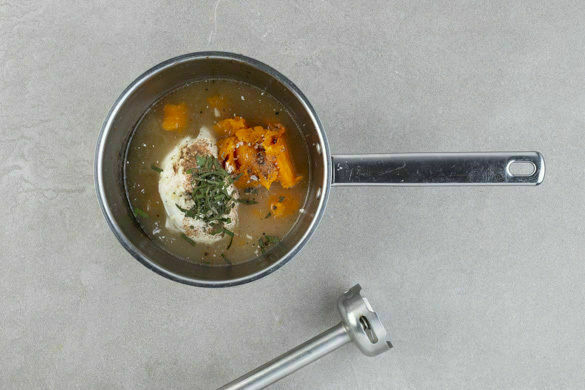 Das Kürbisfleisch in dem kleinen Topf mit 80ml Wasser, der Crème fraîche und dem Thymian bei mittlerer Hitze ca. 4Min. sanft köcheln lassen und nach Geschmack mit dem Knoblauch sowie Salz und Pfeffer würzen. Anschließend mit einem Stabmixer zu einer cremigen Sauce pürieren.