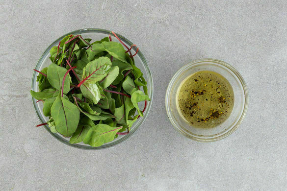 Aus 2EL Olivenöl, 2EL Essig, 1–2EL Wasser, 1 Prise Zucker, ½TL Salz und 1 kräftigen Prise Pfeffer ein Dressing anrühren und mit dem Mangold vermengen. Den gefüllten Kürbis mit der Sauce und dem Salat anrichten, mit der Petersilie garnieren und servieren.
