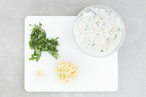 Den Knoblauch schälen und fein würfeln. Die Basilikumblätter von den Stängeln zupfen und grob schneiden. Die saure Sahne mit ¼ des Käses, der ½ des Basilikums, 1 kräftigen Prise Salz und 1 Prise Pfeffer verrühren.